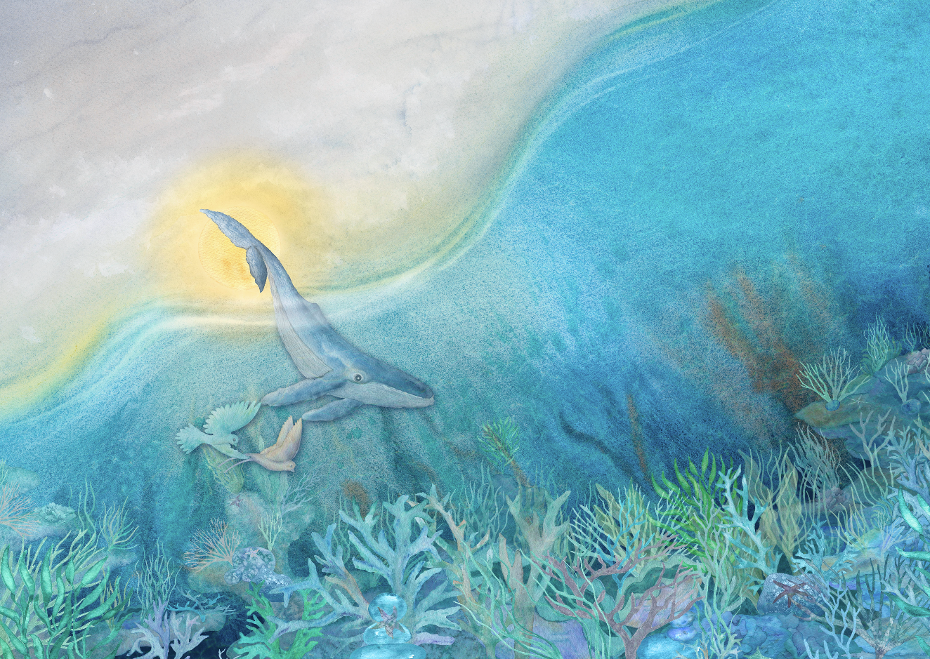 A whale, a swallow and a dove journey homewards, from the stars to the sea. The coral reef of their watery world is waiting for their return. And with it, they bring the light of a new day. Their presence pushes away the shadows.