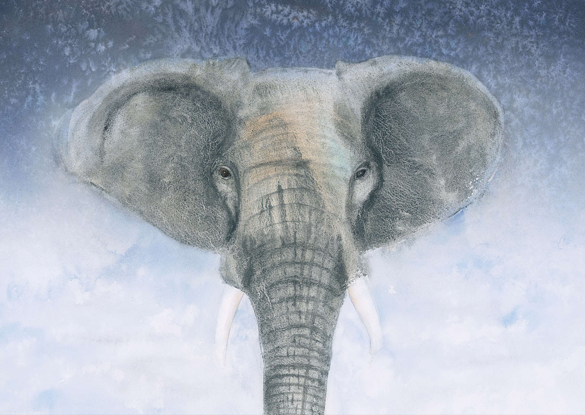 An elephant's face spans the stars, as a herd of elephants cross picture book plains.