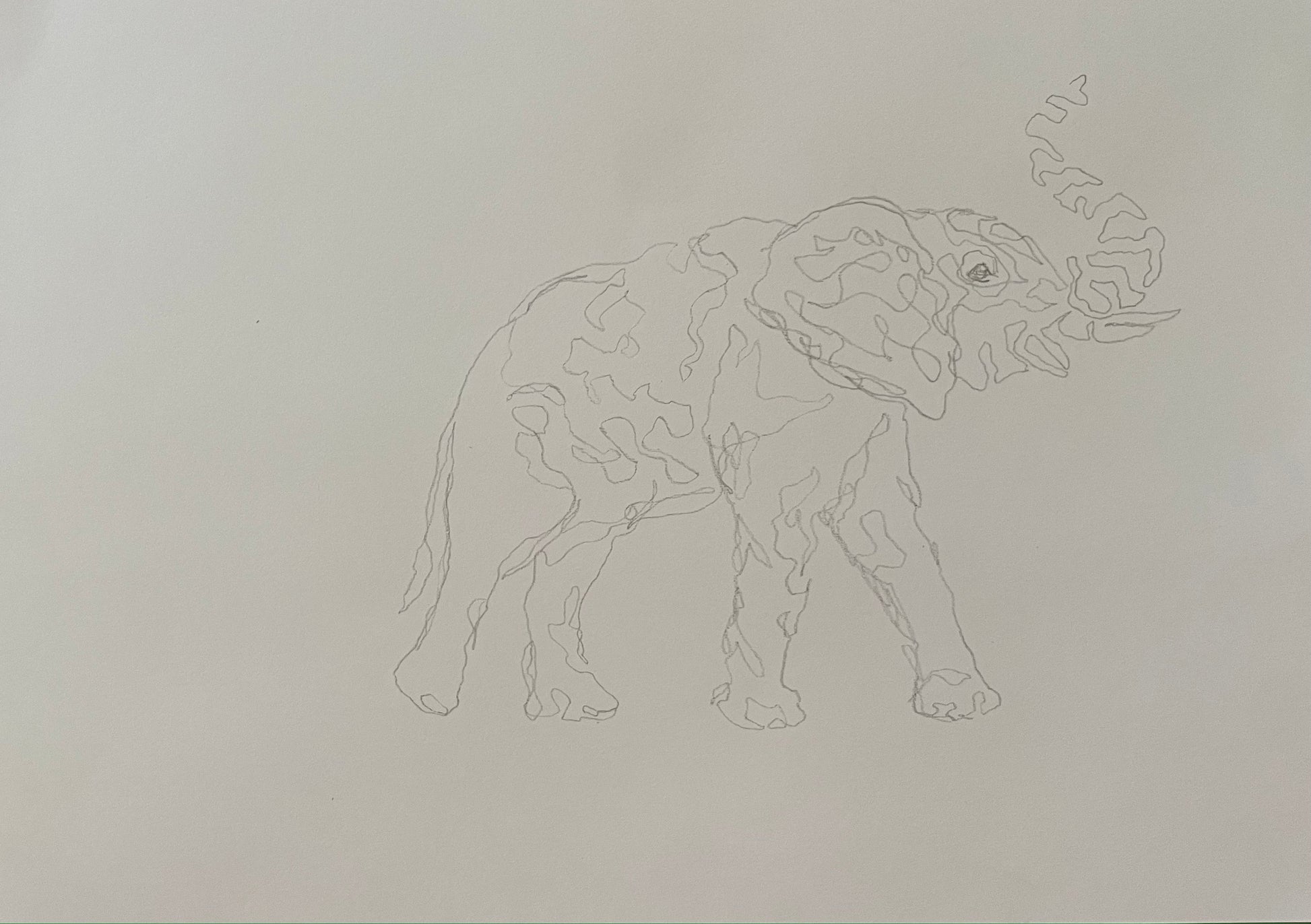 An elephant walking along picture book plains, expressed in a continuous line drawing. Side view profile, with the trunk protruded upwards as a symbol of good luck and prosperity.