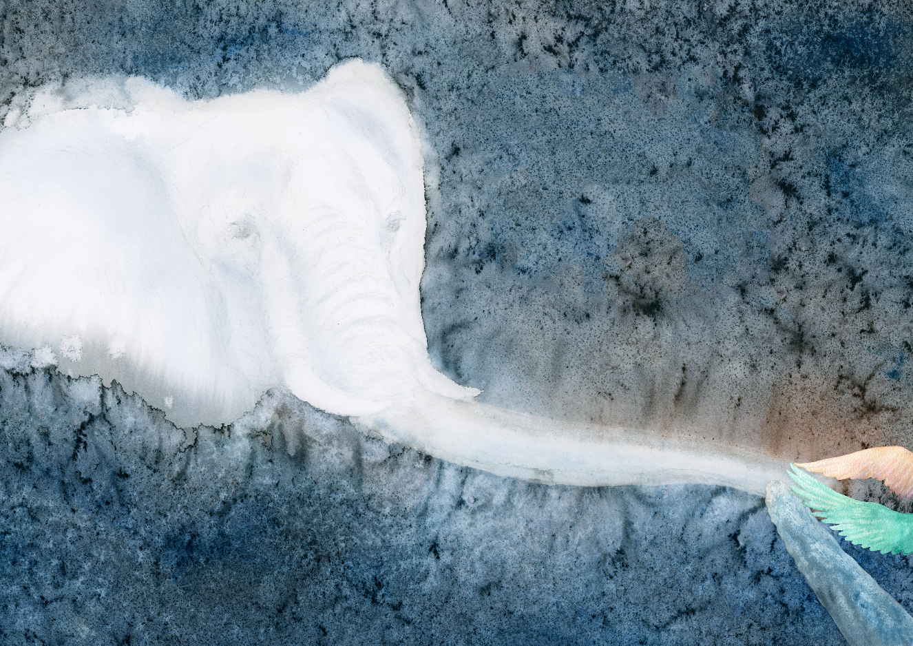 An elephant's face spans the stars, as bright as the light of a glowing and kind moon. The spirit lingers, and extends their trunk to reach the children. A flipper and two wings embrace in this serene moment of connection.