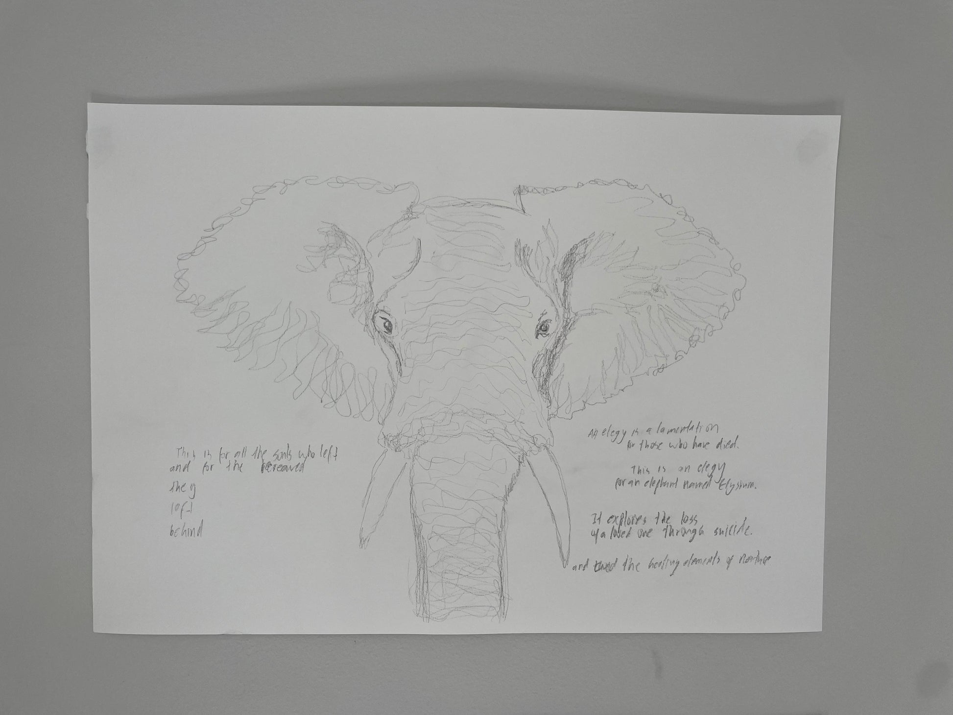 An elephant's face emerges in the sky, and looks out to the reader. This sketch defined the final artwork.  The text is also sketched in here, reflecting the considerations of text windows, composition, and positive and negative space.